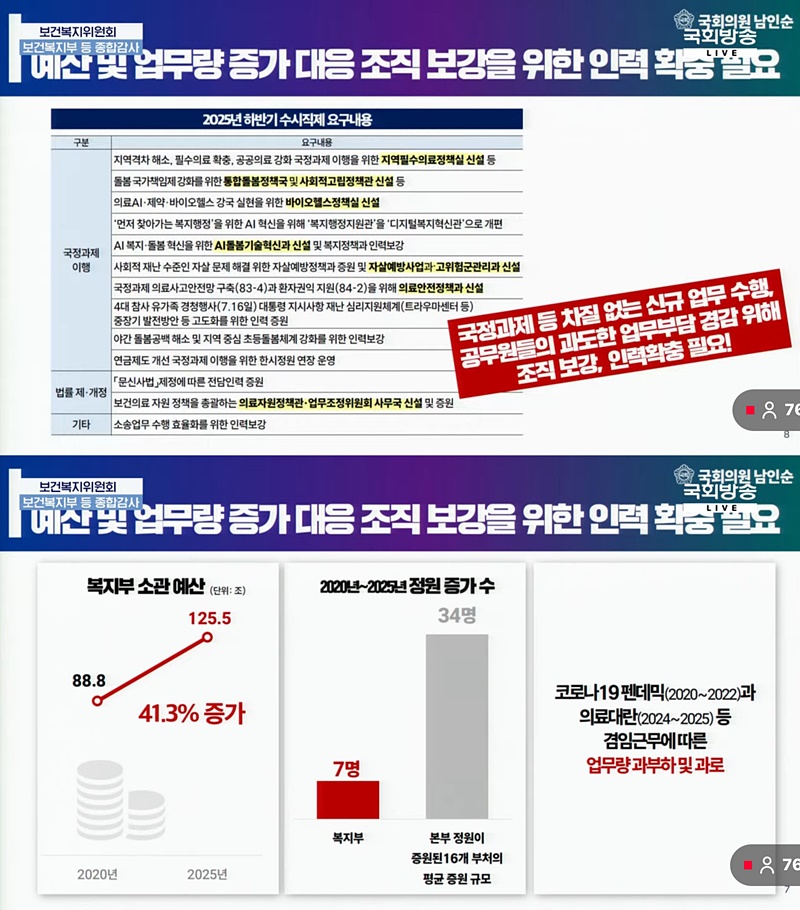 º¸°Çº¹ÁöºÎ ¿¹»êÀº ¿ÃÇØ 125Á¶5000¾ï¿ø, ³»³â 137Á¶6000¾ï¿ø ¼öÁØÀ¸·Î ±Ô¸ð ¸é¿¡¼­ Á¤ºÎºÎó °¡¿îµ¥ ¿ùµîÈ÷ 1À§ÀÎ ¹Ý¸é, Á¶Á÷ º¸°­°ú ÀÎ·Â È®Ãæ ¹ÌÈíÀ¸·Î °ø¹«¿ø ´ë´Ù¼ö°¡ ¾÷¹«·® °úºÎÇÏ¿¡ ½Ã´Þ¸®´Â ½ÇÁ¤À̶ó´Â °Ô ¿©¾ß º¹ÁöÀ§¿øµéÀÇ ÁöÀûÀÌ´Ù.
