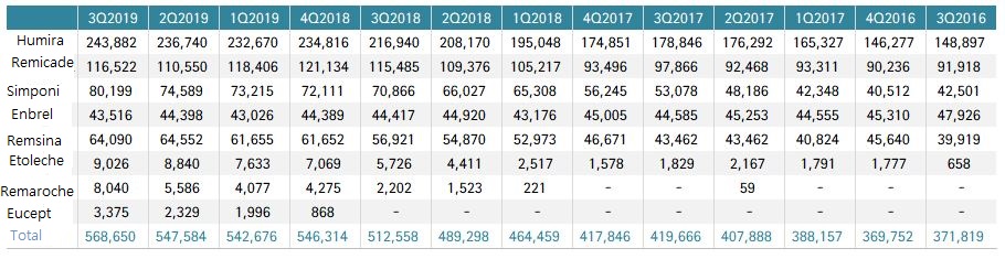 Humira & Simponi grow greatly, but Enbrel decreases only