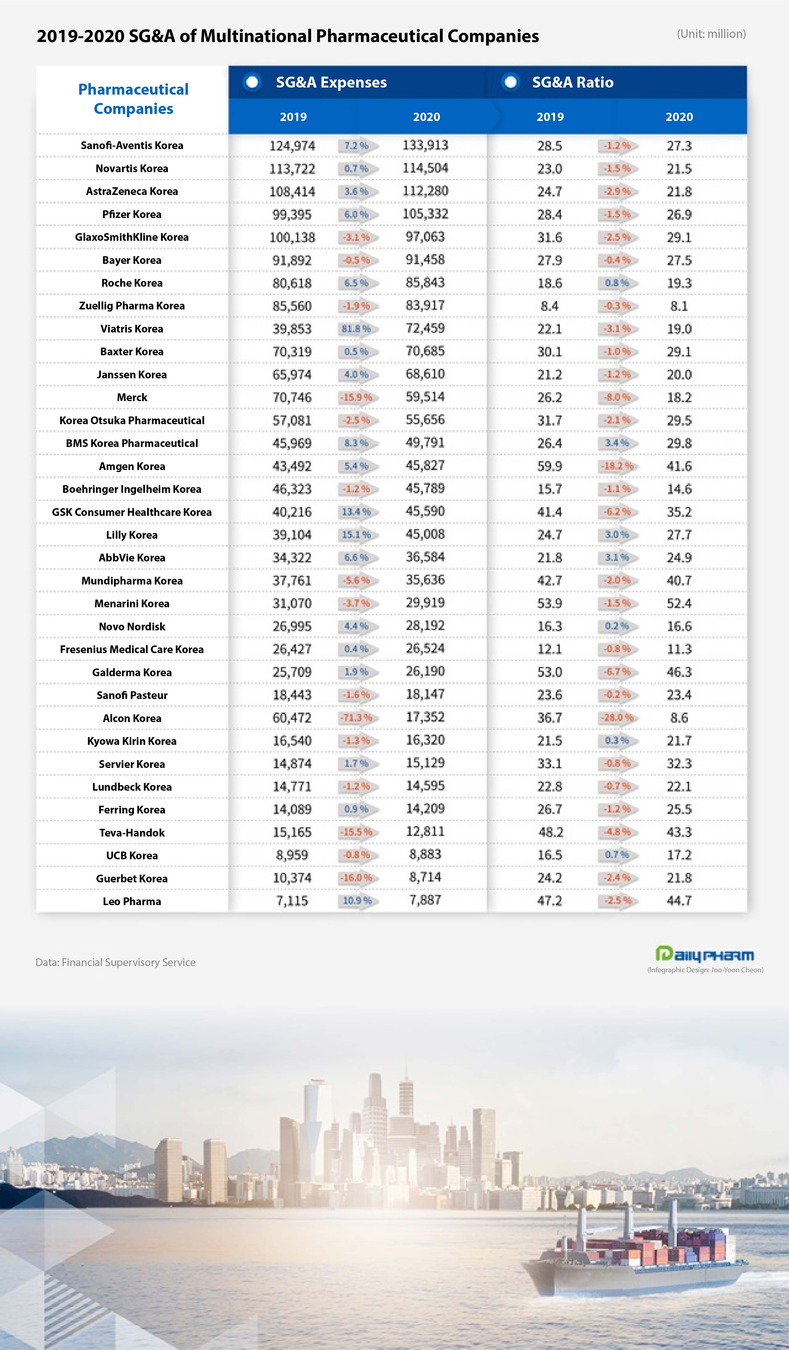 Korean subsidiaries of multinational pharmaceutical companies have lowered their selling, general & administrative (SG&A) to sales ratio last year due to the prolonged COVID-19 crisis. Analysts predict that the cost-cutting measure was made in response to the disruptions in face-to-face sales and marketing activities caused by the pandemic.